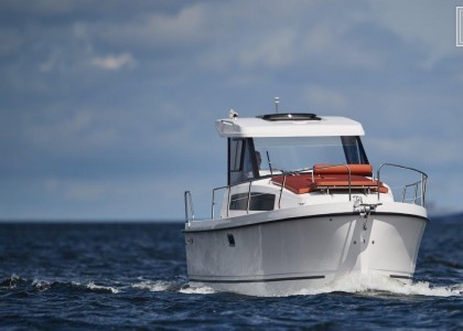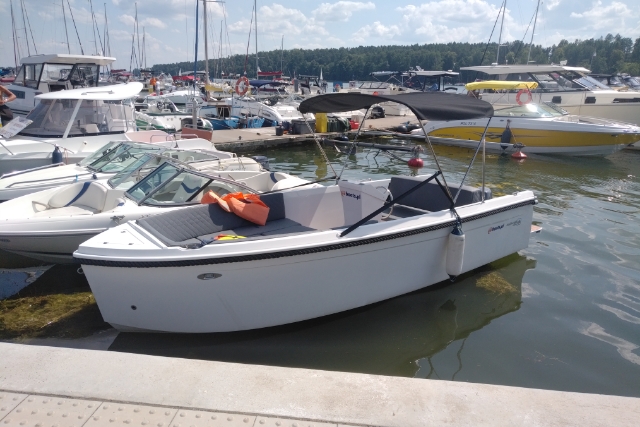 Stabilna łódź motorowa. Idealna na krótkie wyprawy na wodzie, rekreację i wędkowanie. Wyposażona w sundeck z tapicerką przy sterówce, platformy pływające, 4 knagi. Maksymalna moc silnika 25 KM umożliwa pływanie bez patentu.